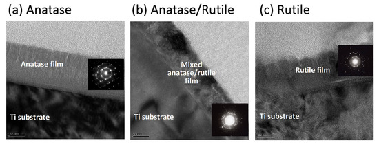 Crystal phase structure of TiO2 thin films on different test Ti specimens, analyzed via TEM. The thickness of the oxide layer in the form of anatase phase, rutile phase, and a mixture of two phases was roughly 45 nm.