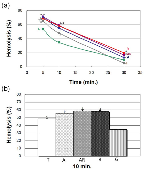 Whole blood coagulation, in terms of hemolysis vs. time, on different test specimens: (a) for up to 30 min; (b) at 10 min. Coagulation was less extensive on treated Ti specimens than on silica glass specimens. In the first 10 min, the test Ti specimens showed higher hemolysis values, namely less coagulation ability, than silica glass specimens; the untreated T group had the lowest hemolysis value among the test Ti groups (groups with different lowercase letters are significantly different (p < 0.05)).