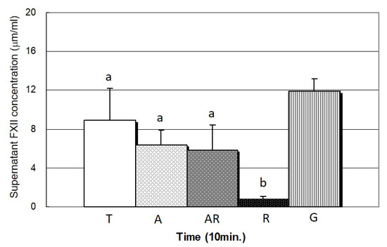FXIIa concentrations in supernatant, calculated at 10 min from test specimens. The amount of FXIIa in supernatant of R group was the least (p < 0.05), indicating amount of FXIIa on surface of R specimen was the highest (groups with different lowercase letters are significantly different (p < 0.05)).
