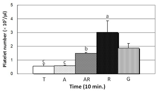 The surface energy values were as follows: A group (756 mN/m), R group (760 mN/m), AR group (761 mN/m), and T group (753 mN/m) (see Table 1). All of the test Ti specimens presented hydrophilic surfaces, as evidence by water contact angles of 44–54° [39]. One previous study reported a significant correlation between the hydrophilicity of Ti surfaces and thrombin content [40]. Note, however, that elevated hydrophilicity can have a negative effect on fibrinogen adsorption, platelet adhesion, and platelet activation [41], due to the energy barrier created by surface-adsorbed liquid [15].