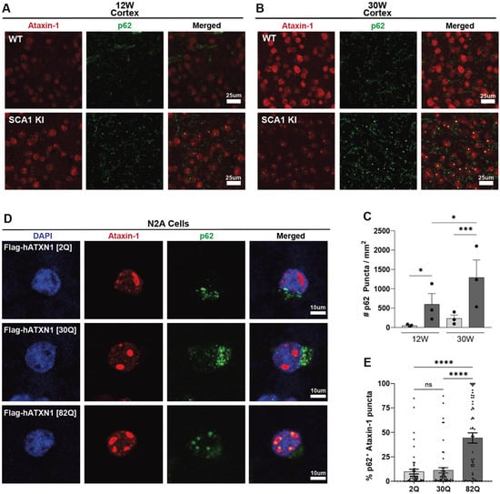 Next, we were interested in investigating the ataxin-1 nuclear inclusions in the cortex. Aggregations of disease-causing proteins are observed across diverse neurodegenerative disorders [15,16,17,18,19,20,21,22]; however, the impact of these aggregates towards disease progression is still not fully understood. In SCA1, ataxin-1-positive aggregates are observed across diverse brain regions, although less so in the cerebellum [10]. Here, we imaged ataxin-1 aggregates in the motor cortex and observed that these aggregates colocalized with the autophagy/proteaseome marker p62 (Figure 2A–C). Interestingly, p62 aggregates were progressively increased in the SCA1 cortex, with significant increase compared to WT littermate controls at both 12 and 30 weeks (Figure 2A–C). We also found that colocalization of p62-positive aggregates and ataxin-1 nuclear inclusions was observed in other brain regions of SCA1 mice, including the striatum and hippocampus, with minimal to no colocalization in the SCA1 brainstem and cerebellum at 30 weeks (Figure S1). Given the role of p62 in autophagy and proteasomal degradation of ubiquitinated proteins [43], as well as previous literature suggesting that p62 may aid in degrading aggregated polyQ-expanded ataxin-1 in vitro [44], we were interested if this colocalization occurred in a polyQ-dependent manner. To investigate this, we transfected N2A cells with 2Q, 30Q, and 82Q human ATXN1 (Flag-hATXN1) plasmids (Figure 2D). After 48 h, 44.3% of N2A cells transfected with hATXN1 [82Q] formed mutant ataxin-1 nuclear inclusions colocalized with endogenous p62, in contrast with 9.9% and 11.3% of N2A cells transfected with hATXN1 [2Q] and −[30Q] having p62-positive ataxin-1 nuclear inclusions, respectively (n = 50 cells per condition) (Figure 2D,E). This significant increase in hATXN1 [82Q] colocalization with p62 in nuclear inclusions, along with the observed increase in p62 aggregates in SCA1 cortex in vivo, suggests that this colocalization occurs in a polyQ-dependent and region-specific manner.