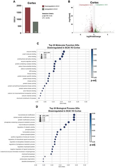 Given these observed morphological changes in the SCA1 KI mouse cortex, we were interested in investigating potential molecular mechanisms in which mutant ataxin-1 impacts the cortical transcriptome, as the role of ataxin-1 as a transcriptional regulator, and the impact of this towards the transcriptional signature of the cerebellum and inferior olive, has been well established [8,24,25,26,27,45]. We performed bulk RNA sequencing of the SCA1 KI mouse cortex at 12 weeks, and observed a high number of up- and downregulated genes in the SCA1 cortex compared to WT littermate controls (1853 downregulated differentially expressed genes (DEGs), 819 upregulated DEGs) (Figure 3A,B, Table S1). Genes with an FDR-adjusted p-value < 0.05 and a log2foldchange (LFC) greater than |0.25| were considered significant and used for further analyses. The top Gene Ontology (GO) terms for the downregulated DEGs were largely related to phosphorylation and kinase regulation, calcium channel activity, synaptic organization and function, and dendrite development, etc. (Figure 3C,D, Table S2). In contrast, the top GO terms for the upregulated DEGs were mainly related to transcriptional regulation and chromatin binding (Figure S2, Table S3). Together, these data support that mutant ataxin-1 expression is significantly impacting the cortical transcriptome in the SCA1 KI mice.