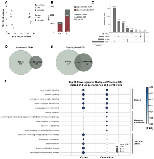 Regional comparison of shared and unique disease signatures between SCA1 KI mouse cerebellum and cortex at 12 weeks. (A), PCA plot of bulk RNA sequencing samples, showing samples cluster by region (shape) and genotype (color). (B), Number of DEGs that are up- and down-regulated in the SCA1 KI relative to WT for the cerebellum (CB) and cortex (CX). Genes with an FDR adjusted p-value < 0.05 and a log2foldchange > |0.25| were considered significant. (C), Upset plot showing number of up- and down-regulated DEGs shared across conditions. Set size indicates number of DEGs per condition, and intersection size indicates number of DEGs overlapping with indicated nodes. (D,E), Venn diagram indicating number of upregulated (D) and downregulated (E) DEGs that are unique to each region and shared across the cerebellum and cortex. (F), Top 15 Biological Process GO terms for downregulated DEGs in the SCA1 KI cerebellum and cortex that are shared across cerebellum and cortex (top), unique to the cerebellum (middle), and unique to the cortex (bottom). GO terms are plotted with circle color indicating FDR adjusted p-value, and circle size indicating gene ratio.