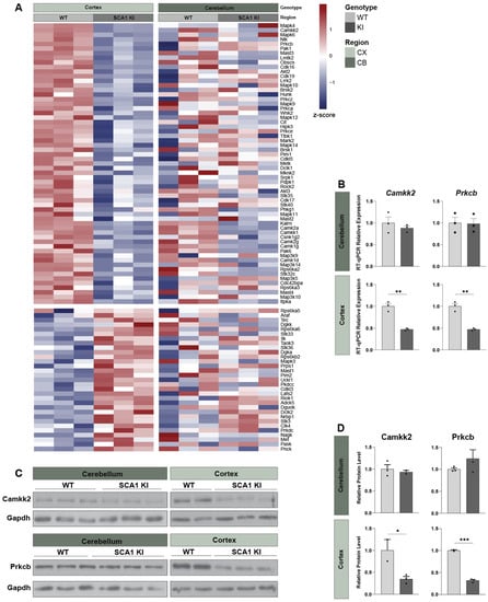 We also identified region-specific differences in transcriptional alterations. We found that the top GO hits for downregulated DEGs that were unique to the cerebellum related to G-protein coupled receptor signaling, dopamine response, and serotonin receptor signaling, etc. (Figure 4F, Figures S4 and S5B, Table S4). In contrast, kinase regulation and phosphorylation were consistently downregulated in the SCA1 KI mouse cortex, but unchanged in the SCA1 cerebellum (Figure 4F, Figures S4 and S5C, Table S4). Among the upregulated DEGs, cell morphogenesis and transcription regulation were specific to the SCA1 KI mouse cerebellum and the cortex, respectively (Figure S6B,C, Table S5). Given previous literature investigating kinases in SCA1 [46,47,48], including region-specific targeting of kinases as a potential effective therapeutic approach [48], we further investigated this change in gene expression. We confirmed a significantly altered expression of serine-threonine kinases in the SCA1 KI mouse cortex that was not observed in the cerebellum (Figure 5A). We validated that this downregulation was observed only in the SCA1 KI mouse cortex and not the cerebellum at 12 weeks for a subset of kinases, specifically Camkk2 and Prkcb, as these were among the top 10 differentially expressed kinases in the cortex (Figure 5B–D). Taken together, these data suggest that there are region-specific and shared cross-regional molecular changes occurring in the SCA1 KI mouse brain (Figure 4, Figure 5 and Figure 6, Figures S4 and S5).