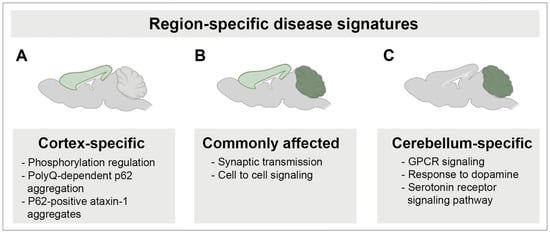 Schematic of shared and region-specific changes observed in the SCA1 KI mouse cortex and cerebellum during early stage of the disease at 12 weeks. (A), Cortex-specific changes observed in the SCA1 KI mice include region-specific differences in p62 aggregation colocalizing with ataxin-1 nuclear inclusions, and phosphorylation regulation. (B), Shared SCA1 disease signatures include synaptic transmission and cell to cell signaling. (C), Cerebellum-specific changes identified in the SCA1 KI mice include GPCR signaling, response to dopamine, and serotonin receptor signaling pathway.