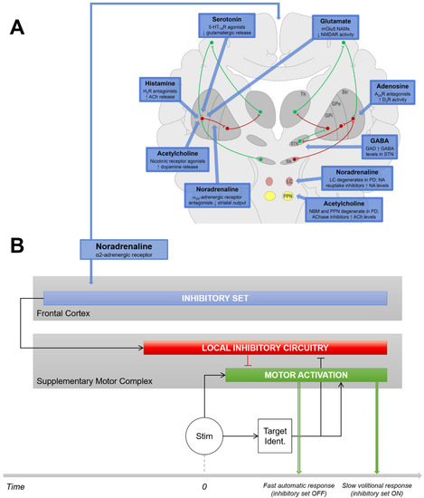 Although Parkinson’s disease (PD) has long been considered a motor and dopaminergic disease, numerous non-dopaminergic neurotransmitter systems are implicated in its motor features (Figure 1A) [1]. Current drugs that modulate the acetylcholinergic, glutamatergic, histaminergic, adenosinergic, GABAergic, serotonergic or noradrenergic (NA) systems might thus provide clinical benefits as add-on therapies to L-dopa by targeting symptoms that may be mediated by nondopaminergic systems [1,2,3,4]. However, the neurochemical bases of numerous motor subfunctions and non-motor functions that modulate movement control are still obscure, making it difficult to associate symptoms with potentially relevant pharmacological solutions.
