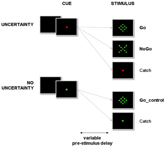 Overview of the experimental setup. Subjects were instructed to react to the presentation of a go signal (diamond) by pressing a button. At the beginning of a trial, the central fixation point (cue) could turn either red or green, indicating, respectively, that NoGo stimuli (X) could or could not be presented. In the former condition (uncertainty condition), proactive inhibition was required during the pre-stimulus period to avoid erroneous automatic responses to NoGo stimuli. In the latter condition, proactive inhibition was not required during the pre-stimulus period. Subjects could react automatically to any upcoming target (no uncertainty condition).