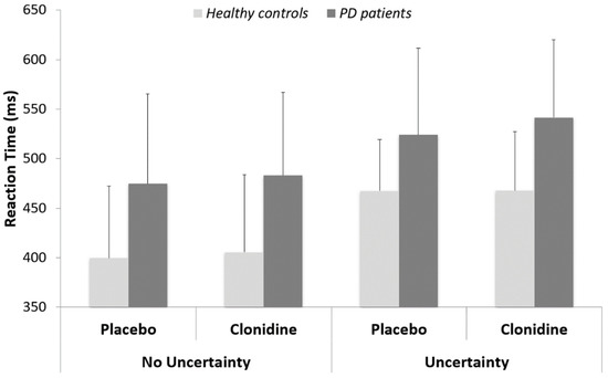 Reaction time (RT): We first tested the effect of treatment (placebo vs clonidine) for all group × task conditions. No significant effect was reported (all p > 0.6). We then tested the effect of task (uncertainty vs. no uncertainty) for both groups, independently of the treatment condition. The RT to Go trials were shorter in the no uncertainty than in the uncertainty condition for both groups (control group: 402 ± 74 vs. 468 ± 55 ms; t (53.3) = −3.87; p < 0.001) (PD group: 479 ± 86 vs. 533 ± 82 ms; W = 171; p < 0.05). Finally, we tested the effect of group for both conditions of task, independently of the treatment condition. The RT of PD patients were longer than the RT of control subjects, both in the no uncertainty (W = 168; p < 0.001) and in the uncertainty (W = 173; p < 0.001) conditions (Figure 3).