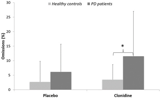 Omissions: A significant effect of treatment (W = 1763; p < 0.05) revealed more omissions in the clonidine (7 ± 10%) than in the placebo condition (4 ± 6%). There was a significant effect of group in the clonidine condition (W = 237; p < 0.05), where PD patients produced significantly more omission errors (12 ± 15%) than controls (3 ± 5%). The effect of group just approached conventional thresholds in the placebo condition (W = 272; p = 0.055), whereas PD patients produced more omission errors (6 ± 10%) than controls (3 ± 7%). No other significant effect was found (Figure 4).