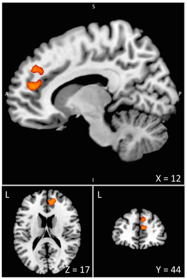 Interaction between drug and disease effects during the pre-stimulus period assessed by means of the [(green cue_(clonidine-placebo)_Patients)-(green cue_(clonidine-placebo)_Controls)] contrast. The differential increase in BOLD signal under clonidine between PD patients and healthy controls is overlaid on the Colin 27 brain template in the MNI space visualized with the Mango software [43]. This overactivation of the anterior node of the proactive inhibition network (mPFC/ACC) is associated with the enhanced difficulty of PD patients to initiate movements when action restraint is not required (control condition with no uncertainty) under the effect of clonidine. L = Left. A = Anterior. S = Superior. X, Y, Z are coordinates in mm in the MNI space.