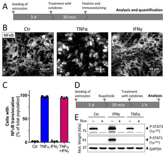 For Western blot analysis of proteins, 500,000 astrocytes were seeded into each well of a 6-well plate (Corning, New York, NY, USA) in astrocyte medium. After 3 days, 20 µM ruxolitinib (Selleckchem, Munich, Germany) was added to some wells. After 30 min, 10 ng/mL TNFα or 20 ng/mL IFNγ (both from R&D Systems, Mineapolis, MN, USA) were added and incubated for 1 h. Then, cells were lysed in 120 µL 1× Laemmli buffer and heated for 5 min at 95 °C. Lysates were centrifuged for 1 min at 10,000× g through NucleoSpin Filters (Macherey-Nagel GmbH, Düren, Germany) to break down long DNA strands. Twenty microliters of lysates were loaded onto 10% SDS gels and gels were run for 30 min at 80 V and then at 120 V until bands reached the bottom of the gel. Proteins were transferred onto nitrocellulose membranes (Amersham, Buckinghamshire, UK) using the iBlot™ 2 dry blotting system (Invitrogen, Waltham, MA, USA). Membranes were blocked with 5% BSA (w/v) in TBS-Tween (0.1% (v/v)) for 1 h. Respective primary antibodies were incubated at 4 °C overnight (Table S8). After washing three times with 5% BSA (w/v) in TBS-Tween (0.1% (v/v)) at room temperature for 10 min each, membranes were incubated with horseradish peroxidase-conjugated secondary antibodies for 1 h at RT (Table S8). For visualization, ECL Western blotting substrate (Pierce/Thermo Fisher Scientific, Rockford, IL, USA) was used and imaged with a Fusion-SL 3500 WL device with Fusion software (Bio-Rad™, Hercules, CA, USA). Antibodies used for Western blot analysis are specified in Table S8.