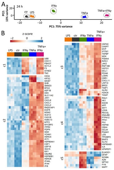 To obtain a comprehensive overview of the AC activation responses, we used transcriptome analysis. For this purpose, cells were stimulated with TNFα, IFNγ or TNFα plus IFNγ for 2, 4, 8, 12, 18, 24 and 72 h. Additionally, ACs were exposed to the gram-negative bacterial endotoxin lipopolysaccharide (LPS). While detailed time-course data are discussed below, we first concentrated on the response patterns and their differences after 24 h of stimulation. A PCA of the gene expression patterns of ACs after this exposure time showed a highly reproducible response under all conditions. All cytokine-driven activation states separated clearly from the control and from each other (Figure 3A).