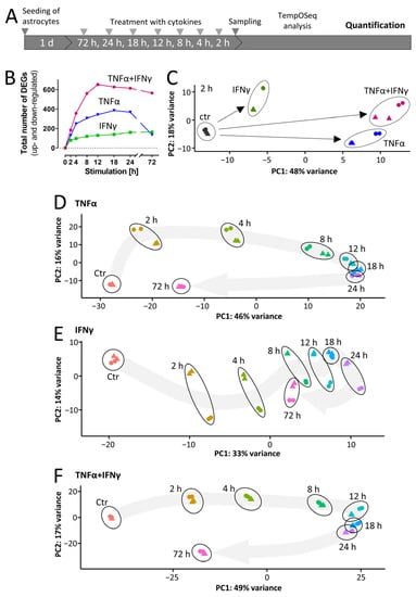 Dynamics of cytokine-induced gene expression in ACs. (A) Schematic representation of the experimental procedure for AC sample generation and targeted RNASeq analysis (TempOSeq method). ACs were seeded at a density of 50,000 cells/cm2 into 96-well plates. On the following days, cells were stimulated with TNFα (10 ng/mL), IFNγ (20 ng/mL) or a combination of TNFα (10 ng/mL) plus IFNγ (20 ng/mL). After the indicated time periods, cells were lysed and gene expression profiling was performed for 3562 genes. (B) The total numbers of differentially expressed genes (DEGs) are depicted. Genes were considered as differentially expressed with p-value ≤ 0.05 (after false discovery rate adjustment) and an absolute log2fold change of ≥0.5. A full list of all genes and their regulation can be found in Supplementary Materials. (C) Principal component analysis (PCA) of the early transcriptome responses (2 h) to TNFα, IFNγ and co-treatment of TNFα plus IFNγ. Triangles and circles show samples belonging to one differentiation batch. The PCA axes are scaled according to the variance covered. (D–F) The time-dependent changes in gene expression in astrocytes in response to (D) TNFα, (E) IFNγ and (F) co-treatment with TNFα plus IFNγ were analyzed by principal component analysis (PCA). The first two PCA dimensions are shown with the axes scaled according to the variance covered. Triangles/circles indicate samples belonging to one differentiation batch. The gray arrows represent the overall trend of gene regulation, they are fitted to the average PCA position of the four samples.
