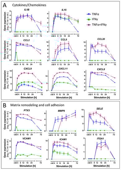 A second, but different, function of ACs is the regulation of endothelial blood–brain barrier (BBB) integrity in a context-dependent manner [67]. We selected representative genes involved in matrix remodeling and cell adhesion [68,69]. For pentraxin 3 (PTX3), matrix metallopeptidase 9 (MMP9), E-selectin (SELE) or an integrin component (ITGA1), we observed a strong (>20 fold) enhancement of transcription by TNFα, but no effect of IFNγ. Cell adhesion molecules (VCAM1, ICAM1) facilitating astrocyte–leukocyte interactions were up-regulated in all three conditions, but the response to IFNγ was always the weakest (Figure 5B).