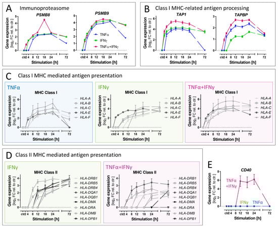 There is rising evidence that not only microglia, but also ACs, can act as antigen-presenting cells under neuroinflammatory conditions [70]. Therefore, we investigated the expression changes in genes related to this function. Genes encoding catalytic subunits (PSMB8, PSMB9) of the immunoproteasome [40] were strongly up-regulated in all treatment conditions (Figure 6A). The same was true for several genes necessary for class I MHC-related antigen processing and presentation (Figure 6B,C). IFNγ is known for its special role in professional antigen-presenting cells, concerning the expression of MHC class II molecules. Cultured astrocytes from rodents and humans do not constitutively express MHC class II. However, they may change their phenotype upon IFNγ treatment [70,71,72,73]. Therefore, the up-regulation of genes encoding MHC class II molecules was examined in ACs generated here (Figure 6D). Indeed, IFNγ triggered a broad up-regulation. TNFα alone did not enhance the transcription of MHC class II genes at any tested time point and even delayed the expression triggered by IFNγ. Our bioinformatics analysis showed that upstream transcriptional regulators related to MHC class II molecules (RFXAP, RFX5) were identified only for the IFNγ-containing treatment conditions (Figure S12).