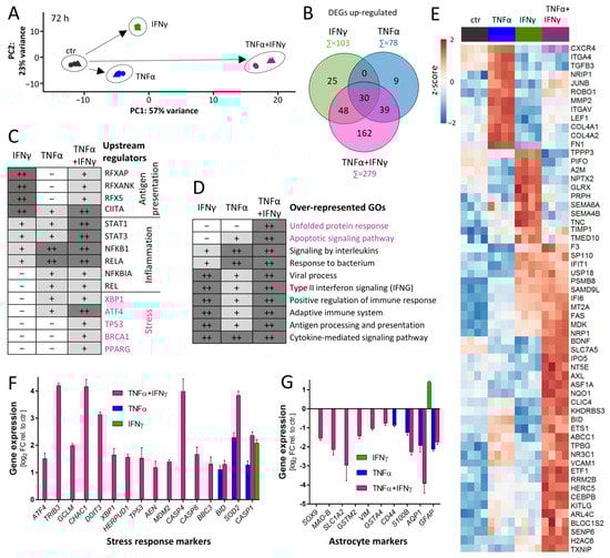 Characterization of response features of ACs after prolonged cytokine exposure. AC transcriptome data were obtained as detailed in Figure 4. Data analysis was focused on the 72 h time point. (A) Principal component analysis (PCA) with arrows indicating the direction and extent of cytokine-induced transcriptome changes. The axes are scaled according to the variance covered. (B) Venn diagram depicting the number of genes up-regulated in ACs ≥ 2-fold and with padj < 0.05. Numbers in overlapping areas represent the genes commonly regulated. Gene names can be found in Table S3. (C) Transcription factors whose binding sites were over-represented on promoters of up-regulated DEGs were identified [59] and labeled here as “upstream regulators”. The boxes of the table indicate the extent to which a stimulus regulated genes controlled by the indicated transcription factors. Dark gray (++) represents strong over-representation (p < 10−12), light gray (+) represents moderate over-representation (10−12 < p < 0.05) and white (-) represents no significant over-representation. Major biological roles of the transcription factors are indicated to the right. Full set of data can be found in Table S4. (D) Gene ontology (GO) analysis was performed [59] with genes induced ≥ 2-fold (padj < 0.05) in ACs stimulated for 72 h. Ten of the top 20 over-represented GOs are shown. Significance is coded as in (C). Full set of data can be found in Table S5. (E) For each treatment condition, the top 20 differentially expressed genes (DEGs based on fold change) were selected. A heat map (row-wise z-scores) was assembled for this pool of 59 DEGs. (F) Regulation of genes encoding proteins involved in stress response pathways in ACs stimulated for 72 h with IFNγ, TNFα or the combination of TNFα plus IFNγ. (G) Regulation of AC marker genes. Data are means ± SD of 4 samples.