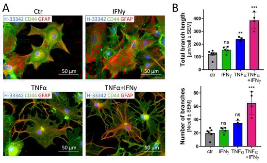 Morphological changes in astrocytes triggered by inflammatory stimuli. ACs (50,000 cells/cm2) were seeded on Matrigel™-coated glass cover slips in 24-well plates. After stimulation for 72 h with TNFα (10 ng/mL), IFNγ (20 ng/mL) or the combination of TNFα plus IFNγ, cells were fixed and stained with anti-CD44 and anti-GFAP antibodies and visualized using an epifluorescence microscope (63× oil objective). Nuclei were counterstained with Hoechst-33342. (A) Representative images. (B) The AC morphology was analyzed using an algorithm determining branch length and the number of branches per cell. Three to five fields (black data points) with an average of about 100 cells per condition were analyzed. Ctr.: untreated ACs. ** p < 0.01; *** p < 0.001 according to ANOVA with Dunnett’s post hoc test. ns, not significant.