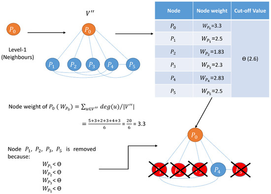 Schematic diagram of computation of node weight. It retains proteins having maximum connectivity. Root node (protein) is denoted by orange while its corresponding neighbors (proteins) are highlighted in blue. The filtered-out nodes (proteins) are represented in red.