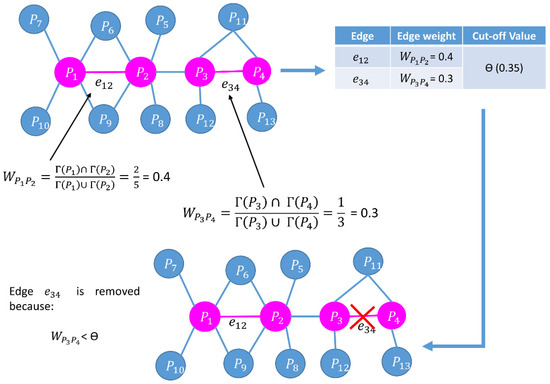 Schematic diagram of computation of edge weight. Edge weight retains only the reliable edges in a PPIN. Edge weight has been calculated for the edges connected with the nodes (proteins) marked with pink color whereas the neighbors (proteins) and their connected edges are highlighted in blue color.