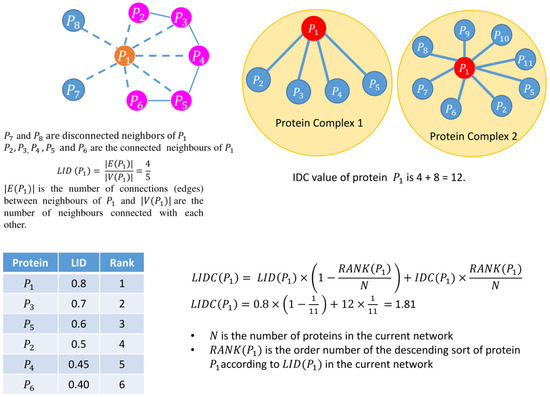 As discussed in the introduction, computational approaches to essential protein prediction can be of two types: (1) topological centrality-based approaches and (2) heterogeneous feature-based approaches. Experimental data [23] show the topology network centrality-based scoring technique, LID [23], and the heterogeneous feature-based approach, LIDC [23], perform better than the other existing approaches to essential protein identification. So, for each node and edge weight cut-off level in the second phase, LID (Luo and Qi 2015) and LIDC [23] are computed for each protein. LIDC combines heterogeneous values obtained from LID, in-degree centrality of complex (IDC) derived from protein complex Complex_745 [23], and ranking of an individual protein. The procedure for computing LIDC is shown in Figure 3. Finally, the proteins are sorted in descending order according to their computed LIDC values. Protein sets are selected as essential in two different ranking ranges (top 100–200 proteins). This selection strategy is the same as in Luo et al.’s work [23].
