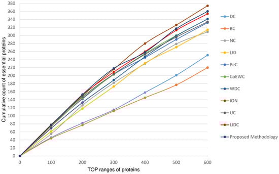 Various research areas like protein structure prediction [1,2]; protein function prediction using protein sequences [3,4], protein domains [5,6], and protein–protein interaction networks (PPIN) [7,8,9,10,11]; protein subcellular localization identification [12,13]; and detection of essential proteins [14,15,16] have significantly been exploited due to the increase in the availability of a large number of proteins/protein sequences in the post-genomic era. In general, essential proteins are the highly connected modules in a PPIN [17]. So, removing any essential protein from the existing network would be fatal, resulting in various functional disorders of living organisms. Most of the research works [18,19,20] note the fact that deeper analyses of essential proteins in a PPIN will lead to better assimilation of ideas about the mutation of genes, which is usually considered as the ultimate cause of disease initiation. Thus, essential protein prediction has a significant role in the medical and biological fields of study. Though computational approaches have become the recent trend for establishing the topological relationship between a PPIN and the essentiality of proteins, the previous biological methodologies [21,22] provided the base for the foundation for this research field. Being directed by the centrality–lethality rule [17], centrality measures based on the topological features of biological PPINs have become the center of attraction for most of the existing methodologies [17,23,24] for the identification of essential proteins.