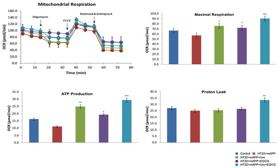 Urolithin A, EGCG and a combination of urolithin A+EGCG. The mitochondrial respiration was evaluated using Seahorse Bioanalyzer in HT22 cells transfected with mutant APP cDNA and treated with urolithin A, EGCG and a combination of both urolithin A+EGCG. The maximal OCR was reduced in muantAPPHT22 cells in comparison to HT22 cells. On the contrary, OCR was increased in mAPPHT22 cells treated with urolithin A, EGCG and a combination of urolithin A+EGCG compared to untreated mAPPHT22 cells. * p < 0.05; ** p < 0.01; *** p < 0.001.