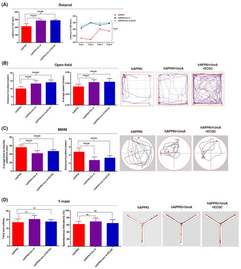 To determine the beneficial effects of mitophagy enhancer urolithin A and a combination of urolithin A and EGCG, we assessed phenotypic behavior using the rotarod for motor coordination, the open field for locomotor activity/exploration abilities, the Y-maze for working memory and the Morris water maze for spatial learning and memory in 7-month-old hAbKI mice treated with urolithin A and a combination of urolithin A+EGCG relative to untreated hAbKI mice.