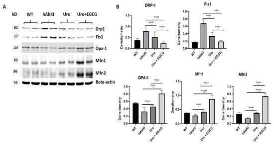 Mitochondrial dynamics proteins: As shown in Figure 3, fission proteins Drp1 (p = 0.05) and Fis1 (p = 0.03) were significantly decreased in urolithin A-treated 7-month-old hAbKI mice relative to untreated hAbKI mice. Significantly reduced mitochondrial fission proteins Drp1 (p = 0.03) and Fis1 (p = 0.03) were found in hAbKI mice treated with urolithin A compared to the combination treatment of urolithin A+EGCG, indicating that combination treatment reduces fission activity better than urolithin A alone. As expected, in comparison to hAbKI mice, combined treatment of urolithin A+EGCG in hAbKI mice showed a further decrease in fission proteins Drp1 (p = 0.04) and Fis1 (p = 0.01) (Figure 3). These observations strongly suggest that urolithin A reduces fission activity, and combined treatment is even better in reducing fission machinery.