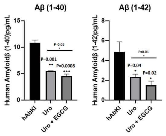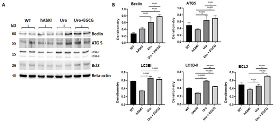 Autophagy Proteins: Significantly increased levels of autophagy proteins (Beclin p = 0.05, ATG5 p = 0.004, LC3B1 p = 0.003, LC3B2 p = 0.0001 and BCL2 p = 0.04) were found in urolithin A-treated 7-month-old hAbKI mice relative to untreated hAbKI mice (Figure 6), and increased levels are even higher for autophagy proteins (Beclin p = 0.04, ATG5 p = 0.002, LC3B1 p = 0.003, LC3B2 p = 0.0001 and BCL2 p = 0.04) in combined treatment of urolithin A+EGCG in hAbKI mice. In hAbKI mice treated with urolithin A compared to combination treatment of urolithin A+EGCG, autophagy proteins Beclin (p = 0.05), ATG5 (p = 0.01) and BCL2 (p = 0.006) significantly increased, indicating that combination treatment is better than urolithin A alone for autophagy.