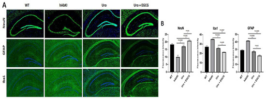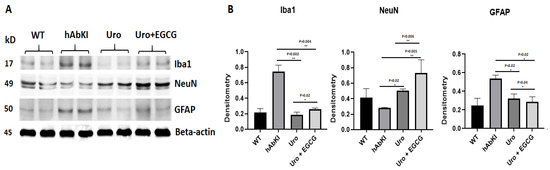 Inflammatory proteins: As shown in Figure 7, microglial marker Iba1 (p = 0.002) and astrocytic marker GFAP (p = 0.02) proteins were significantly reduced in hAbKI mice treated with urolithin A and this reduction is even higher in urolithin A+EGCG-treated hAbKI mice, Iba (p = 0.004) and GFAP (p = 0.02) relative to untreated hAbKI mice. On the contrary, neuronal marker NeuN showed a significantly increased in both urolithin-treated A (p = 0.02) and combined treatment of urolithin A+EGCG (p = 0.005) in hAbKI mice relative to untreated mice. In hAbKI mice treated with urolithin A compared to the combination treatment of urolithin A+EGCG, microglial marker Iba1 (p = 0.004), astrocytic marker GFAP (p = 0.02) proteins were significantly reduced and neuronal marker NeuN (p = 0.006), significantly increased, indicating that combination treatment is better than urolithin A alone.