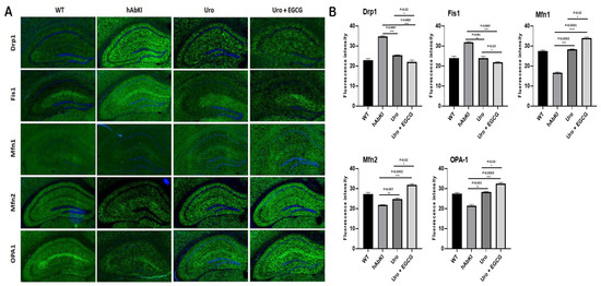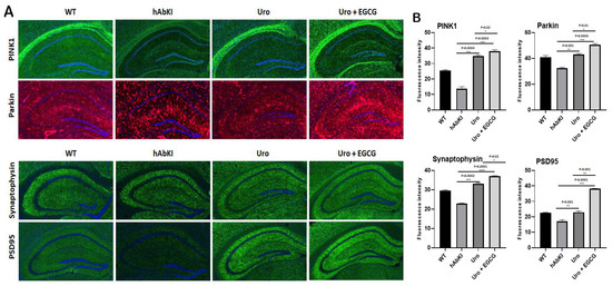 Using hippocampal brain sections from hAbKI mice and urolithin A-treated and urolithin A+EGCG-treated hAbKI mice, we performed immunofluorescence analysis of mitochondrial dynamics, mitochondrial biogenesis, synaptic and inflammatory, and neuronal proteins in order to understand the impact of urolithin A and urolithin A+EGCG treatment in the hippocampus of hAbKI mice.