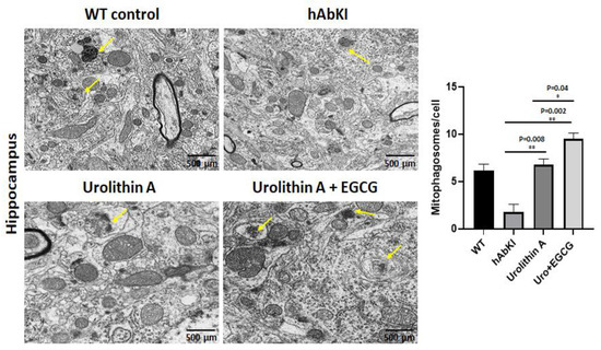 Mitophagosomal formations were assessed in hippocampal sections using ten random micrographs from urolithin A and combination of urolithin A+EGCG-treated and untreated hAbKI mice [44,45,46].