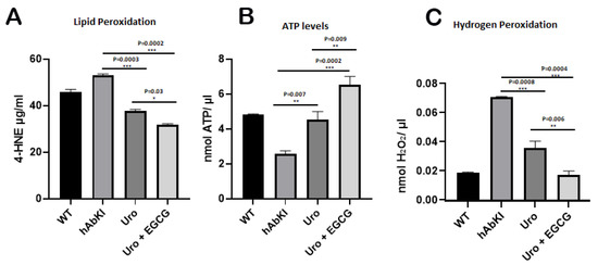 As defined before in Reddy et al. 2018 [23], levels of 4-hydroxy-nonenol were measured using HNE-His ELISA Kit (Cell BioLabs, Inc., San Diego, CA, USA). In short, freshly prepared protein lysates were added to a 96-well protein-binding plate and incubated overnight at 4 °C. Later, the plate was washed 3 times and the anti-HNE-His antibody was added to the protein, which was then incubated for 2 h at room temperature. Then, a secondary antibody conjugated with peroxidase was added to the samples and incubated for 2 h at room temperature. Next, an enzyme substrate was added to the sample and incubated at room temperature. Optical density was measured (at 450 nm) to count the level of HNE.
