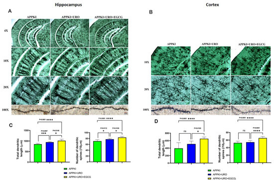 Dendritic Spine Analysis Using Golgi–Cox Staining. We used 7-month-old treated and untreated hAbKI mice brains for this study. Dendritic spines of neurons in the brains were detected by Golgi–Cox staining, using the FD Rapid GolgiStain Kit (PK401, FD NeuroTechnologies, Columbia, MD, USA) as explained previously [44,45,46]. Mouse brain tissues were infused for 2 weeks and handled as per the manufacturer’s instructions. All the procedures were performed in dark conditions. In short, images of dendrites within the CA1 subregion of the hippocampus and cerebral cortex were taken by using a 4×, 10×, 20× and 100× objective by using an AMG EVOS microscope (Thermo Fisher Scientific, Waltham, MA, USA) or an Olympus IX83 (Olympus Corporation, Tokyo, Japan). We selected roughly 20 neurons randomly from each group of mice and measured them with a double-blind, controlled design. To evaluate the number of spines and the total dendritic length, ImageJ and Image-Pro Plus software were used.