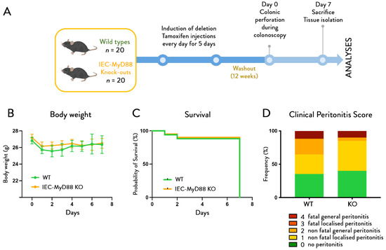 To this aim, we used mice with an inducible intestinal-epithelial-cell-specific deletion of MyD88. In a first experiment (Figure 5A), we determined whether the intestinal-epithelial-cell-specific inactivation of MyD88 itself had any effect on body weight, survival, and peritonitis severity. We found that intestinal-epithelial-cell-specific deletion of MyD88 did not affect the development of peritonitis, and no differences between both genotypes were observed for any of the parameters tested (Figure 5B–D).