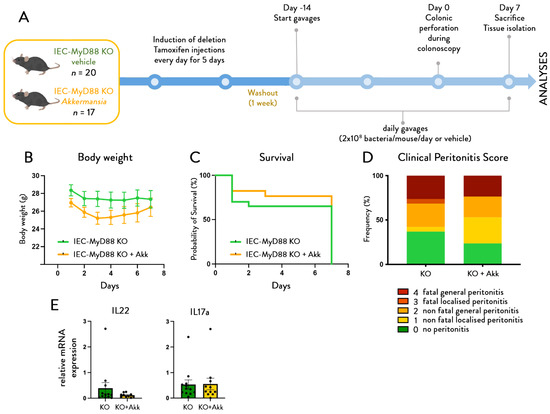Experiment 4 aimed at investigating whether mice treated with A. muciniphila but lacking Myd88 specifically in the intestinal epithelial cells (IEC-Myd88 KO) were responding or not to the treatment and whether they developed a different phenotype than control mice on body weight, mortality, peritonitis severity, and intestinal markers in the colonoscopic leakage model. For this experiment, we used 11-week-old, male, IEC-Myd88 KO mice that we obtained as mentioned above, but with the usual wash out period. They were randomly assigned to one of two conditions: the control IEC-MyD88 KO group, gavaged with vehicle (IEC-Myd88 KO, n = 20), or the test group gavaged with 200 µL of a solution containing 1 × 109 live cells of A. muciniphila per mL (IEC-Myd88 KO Akkermansia, n = 17), with gavages performed for 2 weeks before proceeding to the colonoscopic controlled perforation (day 0). The mice were followed up closely and the gavages were continued for one week until the sacrifice (day 7), when the mice were killed under anesthesia and tissues were collected for analysis.