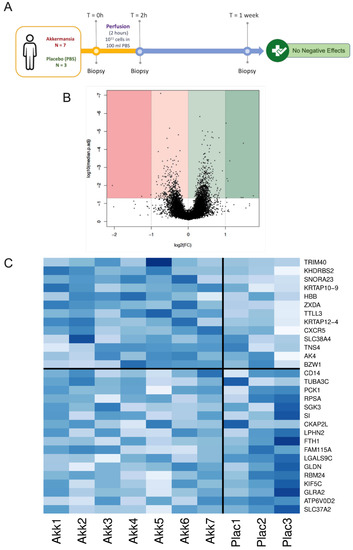 Proof-of-concept study in healthy humans treated 2 h with A. muciniphila on gene expression versus baseline treatment and placebo. (A) Experimental design and volcano plot showing transcriptional analysis on colonic biopsies after 2 h perfusion versus basal. (B) Dark and light pink left parts of the volcano plot represent the genes downregulated 2 h after exposure to A. muciniphila, whereas the dark and light green on the right part represent the genes upregulated 2 h after exposure to A. muciniphila. Both dark pink and dark green parts are showing genes for which the expression is changed by a magnitude of at least 2-fold after 2 h perfusion with A. muciniphila versus basal (i.e., before exposure). (C) The heatmap is based on the 30 genes displaying significant (adj-p values smaller than 0.05) and largest absolute fold changes in the comparison A. muciniphila (Akk) vs. placebo (Plac). In the heatmap, the genes presented above the horizontal line represent upregulation of A. muciniphila vs. placebo while the genes presented below the horizontal line represent downregulation of A. muciniphila vs. placebo. Every single column represents one subject, i.e., exposed to A. muciniphila (left of the vertical line) or exposed to placebo (right of the vertical line). The genes changed, their levels of expression, names, and statistical changes are shown in Supplementary Table S1.