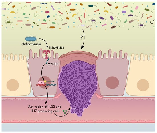 Working and mechanistic model proposed.A. muciniphila activates Toll-like receptors (TLRs) and a signal is transferred via the adaptor protein MYD88 leading to the expression of certain yet unknown mediators that activate the production of IL22 and IL17, which in turn results in improved wound healing and better general outcome. (?) depicted potential other unidentified signals from the gut microbiota that may also influence this process.