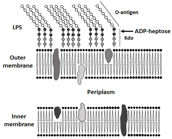 Cell wall structure of gram-negative bacteria. ADP-heptose attaches O-antigen polysaccharide chains to the inner core (Kdo) []. The “deep-rough” mutant LPS structure is unstable due to the lack of negatively charged phosphate groups on heptose residues, which normally stabilize the structure through the interaction with positive ions. Furthermore, the “deep-rough” phenotype leads to increased susceptibility to hydrophobic compounds [].