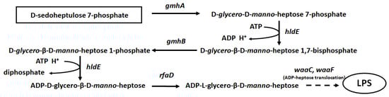 - Valvano, M.A. Biosynthesis and Genetics of ADP-Heptose. J. Endotoxin Res. 1999, 5, 90–95. [Google Scholar] [CrossRef]