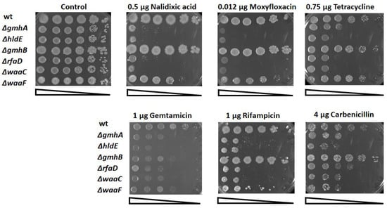 Determination of the sensitivity of strains containing deletions in the gmhA, hldE, gmhB, rfaD, waaC, and waaF genes to various groups of antibiotics. Cells were spotted on LB agar plates in serial 10-fold dilutions and incubated at 37 °C for 24 h.