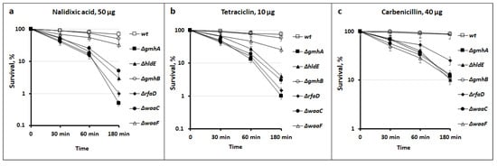 In addition, survival analysis was performed for each mutant on nalidixic acid, tetracycline, and carbenicillin. Bacterial cells were incubated in the presence of lethal doses (means the minimum bactericidal concentration) of antibiotics and plated on a solid medium for further CFU counting (Figure 4). Survival was expressed as a percentage of untreated control.