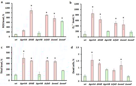 Changes in the level of intracellular ROS, O2*− the level of thiols, and the percentage of dead cells in the population of E. coli cells with deletions of the gmhA, hldE, gmhB, rfaD, waaC, waaF genes. The level of ROS (a) was assessed using the dye DHR123; the O2*− level (b) with DHE dye; the thiols level (c) with ThiolTracker Violet; the percentage of dead cells (d) was estimated using propidium iodide. Parameters for cells with gmhA, hldE, rfaD, and waaC deletions that result in a dramatic increase in antibiotic susceptibility in E. coli cells are shown in red, while parameters for wt, gmhB, and waaF are shown in green. Mean values ± SD from at least three independent experiments are shown. *—p < 0.05, compared to the wild-type cells.