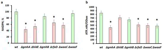 Changes in the intracellular content of NADPH and ATP in the population of E. coli cells with deletions of the gmhA, hldE, gmhB, rfaD, waaC, waaF genes. (a) Changes in the intracellular NADPH level. (b) Changes in the intracellular ATP level. Parameters for cells with gmhA, hldE, rfaD, and waaC deletions that result in a dramatic increase in antibiotic susceptibility in E. coli cells are shown in red, while parameters for wt, gmhB, and waaF are shown in green. Mean values ± SD from at least three independent experiments are shown. *—p < 0.05, compared to the wild-type cells.