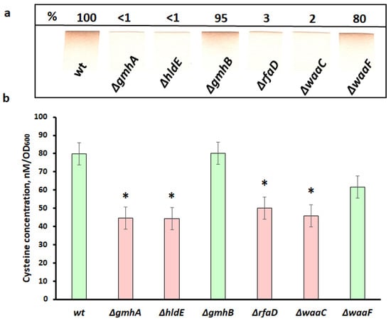Formation of hydrogen sulfide and intracellular concentration of cysteine in the population of E. coli cells with deletions of the gmhA, hldE, gmhB, rfaD, waaC, waaF genes and wild-type cells. (a) Formation of H2S by E. coli cells. Pb-acetate-soaked paper strips show a brown colour of PbS as a result of the reaction with gaseous H2S exiting liquid bacterial cultures (b) Intracellular concentration of cysteine. Parameters for cells with gmhA, hldE, rfaD, and waaC deletions that result in a dramatic increase in antibiotic susceptibility in E. coli cells are shown in red, while parameters for wt, gmhB, and waaF are shown in green. Mean values ± SD from at least three independent experiments are shown. *—p < 0.05, compared to the wild-type cells.