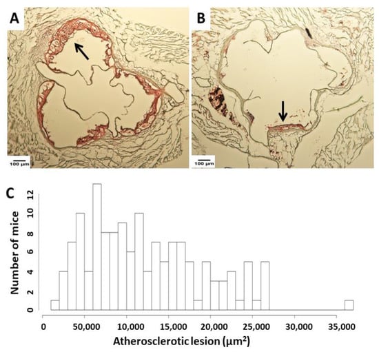 Atherosclerotic lesion analysis in male F2 mice fed 12 weeks of Western diet. (A,B): Representative images from 2 individual mice. Cross-sections of the aortic root were stained with oil red O and hematoxylin. Arrows point at lesions. (C): Atherosclerotic lesion area distribution among F2 mice. The x axis: Lesion areas in µm2.