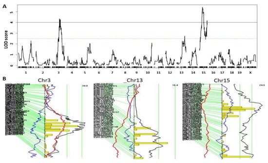 QTL analysis was carried out using R/qtl and Map Manager QTX as reported [,,]. 1000 permutation tests were performed to define genome-wide LOD (logarithm of odds) score thresholds for significant and suggestive QTL with each phenotype. QTL with a genome-wide p value < 0.05 were significant, and those with a genome-wide p value < 0.63 were suggestive []. For interval mapping using QTX, redundant markers were excluded so that every marker had a unique genotyping result for the entire F2 cross.