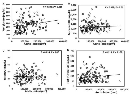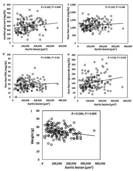 Atherosclerotic lesion sizes showed significant correlations with plasma levels of fasting (r = 0.203; p = 0.015), non-fasting glucose (r = 0.165; p = 0.049), non-fasting triglyceride (r = 0.20; p = 0.016), and body weight (r = −0.236; p = 0.004) (Figure 4A–I). A trend toward correlation was observed with fasting triglyceride (r = 0.115; p = 0.173) and non-fasting non-HDL cholesterol levels (r = 0.116; p = 0.168). No correlation was found with fasting non-HDL (r = 0.116; p = 0.168), fasting (r = 0.080; p = 0.34) and non-fasting HDL cholesterol levels (r = 0.080; p = 0.34).