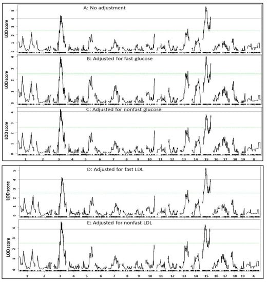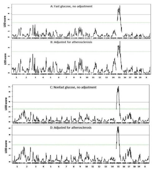 To determine the influence of atherosclerotic lesions on plasma glucose levels, we performed genome-wide scans on residuals from regression analysis of glucose versus atherosclerotic lesions. After adjustment for atherosclerotic lesions, the peak LOD score of the Chr15 QTL for fasting glucose dropped from a significant (5.36) to suggestive level (3.72). For nonfasting glucose, the peak LOD value of the Chr15 QTL dropped from 7.03 to 5.21 (Figure 6), suggesting the existence of genetic connection between atherosclerosis and T2D on the chromosome.