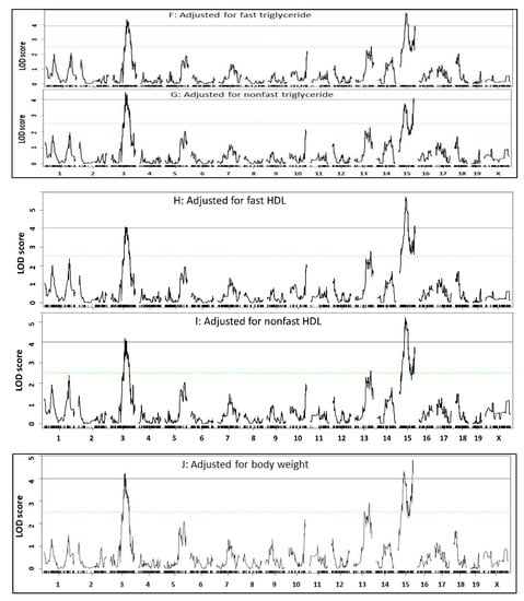 The proximal Chr15 QTL for atherosclerosis showed a slight reduction in LOD score (4.79) after adjusting fasting triglyceride level but a noticeable reduction (4.03) after adjusting non-fasting triglyceride level (Figure 5F,G). Distal Chr15 QTL showed little change in LOD score after adjustment of fasting (3.9) or non-fasting triglyceride levels (4.0).